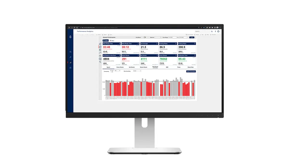 Mit nur wenigen Klicks gewinnen Druckereien wertvolle Erkenntnisse darüber, wo im Produktionsprozess ungenutzte Potenziale liegen. Mit Performance Analytics können Störungsursachen und Trends in der Druckproduktion in Echtzeit erkannt und ausgewertet werden, um Prozesse schnell und zielgerichtet zu optimieren.